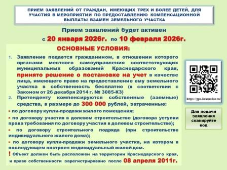 🔴Будет открыт прием заявлений об участии в мероприятии  по получению компенсационной выплаты многодетным семьям, состоящим на учете в муниципальных образованиях Краснодарского края, взамен предоставления им земельного участка в собственность бесплатно.
